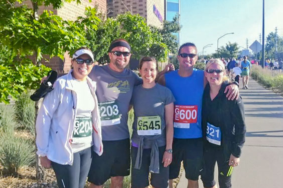 A quick photo of friends before the 2012 Bolder Boulder 10K begins from left to right), Tanya McNellis, Corey McNellis, Melissa Sebold, Scott Davis and Castle Pines Connection staff writer…