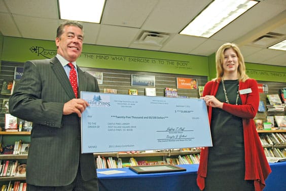 Castle Pines Mayor Jeff Huff (left) presents a check for $25,000 from the City of Castle Pines to Amy Hunt, president of the Douglas County Libraries Board of Trustees. The…