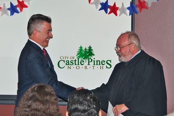 Read MoreMunicipal Judge Lewis Gresh congratulates Jeff Huff after taking the oath as the new mayor of the City of Castle Pines North. Information provided by the City of Castle Pines…