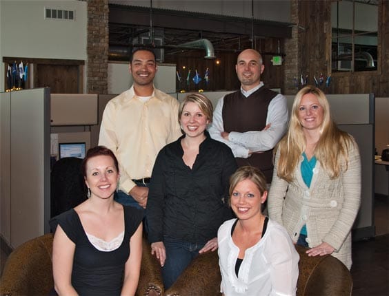 Mywedding.com staff (back row, left to right) Damien Hutchins, President and CEO Woody Pastorius, (center row) Sara Bunke, Katie Lenchuk, (front row) Kelsey Beytien, Brittany Leedahl. By Elizabeth Wood West…
