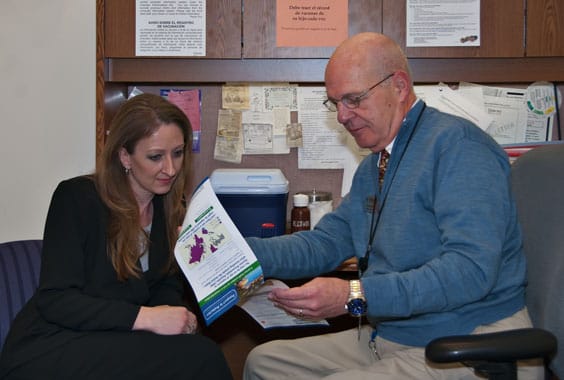 Nurse Ray Levesque (right) and a would-be traveler go over immunization information at the Tri-County Health Department office in Lone Tree. Article by Tracy Dudley with photo by Tim Gamble…