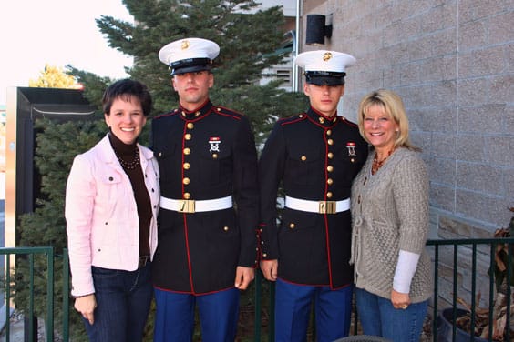 Mothers and sons pose for a photo after graduation from Marine Corps Boot Camp at Camp Pendleton, CA. Pictured left to right: Robyn and Jake McElroy and Joey Riplinger and…