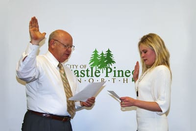Read MoreJanie Berry (right) is sworn in by Douglas County Clerk Jack Arrowsmith in a ceremony in January. Berry was appointed as the new clerk for Castle Pines North late last…