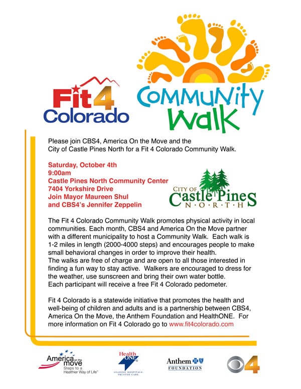 Read MoreOn October 4, the City of Castle Pines North will host “Fit 4 Colorado,” a local community walk sponsored by CBS News 4. The walk will take place in the…