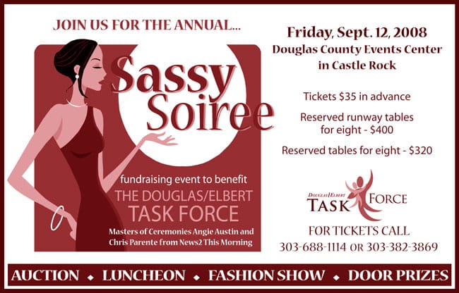 September 12 Mark the calendar for Friday, September 12, and attend the Sassy Soiree luncheon benefiting the Douglas/Elbert Task Force. The luncheon – with silent auction, fashion show and door…