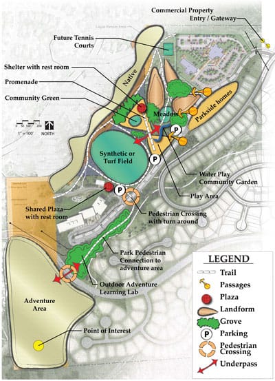 Park illustration provided by Design Concepts by Terri Wiebold Plans for the approximately 37-acre park on the Lagae Ranch parcel between the proposed American Academy Charter School and God’s Grace…