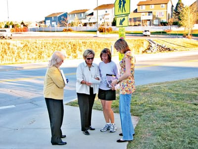 Master Association safety committee members meet with residents at the intersection of Monarch Boulevard and Oxford Drive to discuss ideas for improved safety at the crosswalk at Buffalo Ridge Elementary…