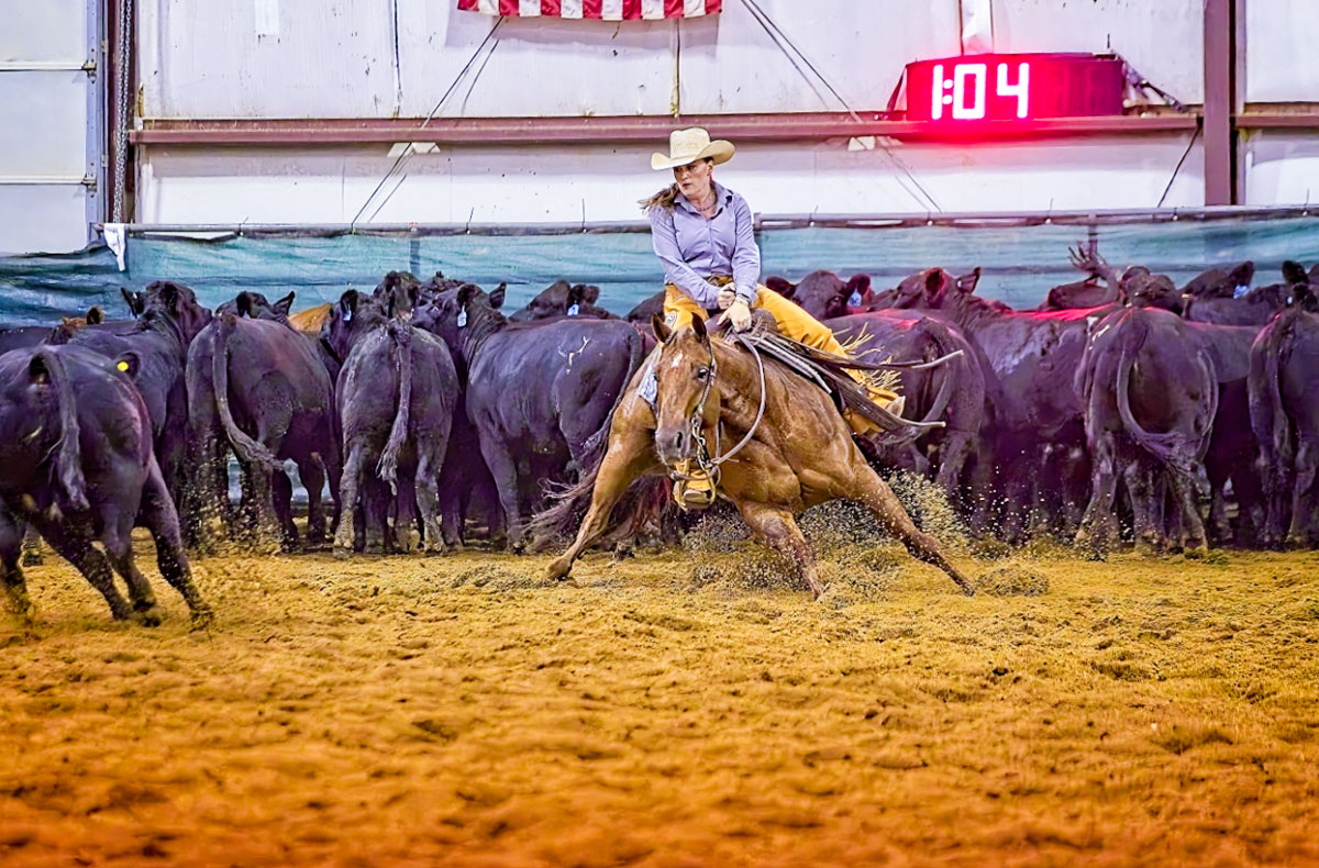 Hannah Nelson exhibiting extreme athleticism and skill maneuvering her horse while cutting during a competition.