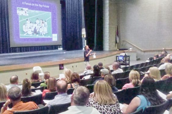 Rock Canyon High School (RCHS) kicked off the school year for athletes and their parents with a Positive Coaching Alliance (PCA) workshop on August 20. Two hundred and seventy athletes learned how to be a “triple-impact competitor” who strives to impact their sport on three levels by improving oneself, their teammates, and the game as a whole. The workshop was presented by Brett Nichols, an accomplished athlete and college basketball coach who is currently pursuing his PhD in the social psychology of sport.
