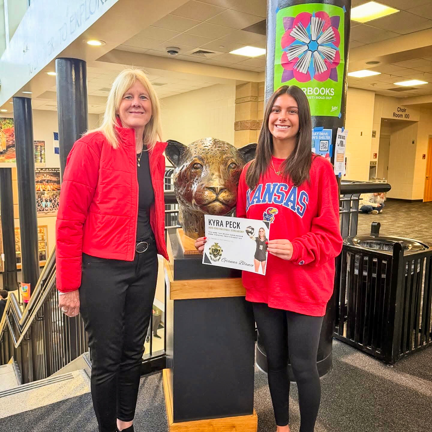 Shari Peck (left) and Gianna Blanco (right) in January at Rock Canyon High School. Gianna was the 2026 recipient of the Because of Kyra volleyball scholarship.