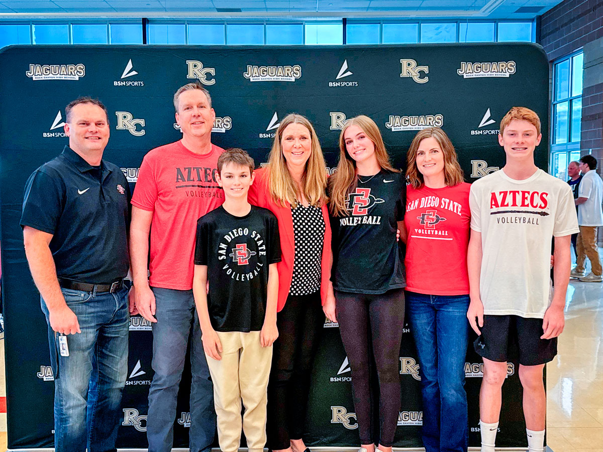 Logan Cary celebrating national signing day to San Diego State University on November 12 with her extended family. From right: Kevin (dad), Kyle (uncle), Will (cousin), Katie (mom), Logan, Ethnie (aunt), Luke (cousin).