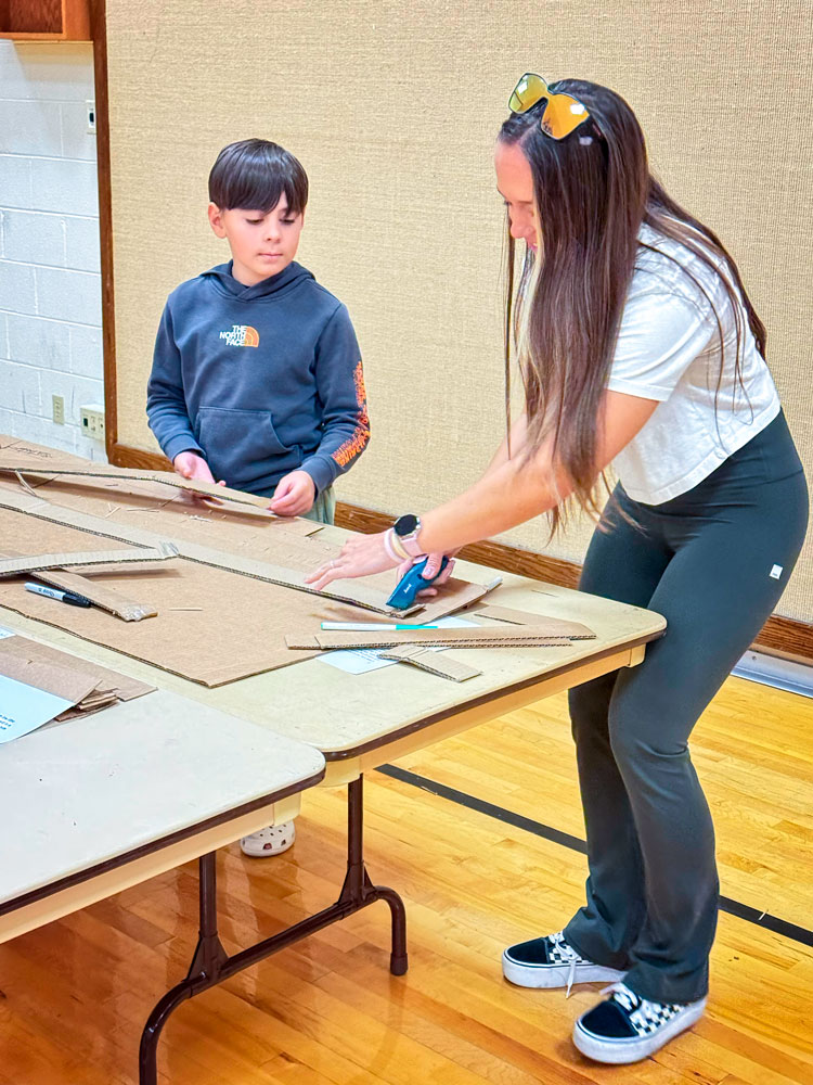 Kara and Luca Harrington cut cardboard to assemble cat scratchers for Minnie’s service project benefiting Humane Colorado.