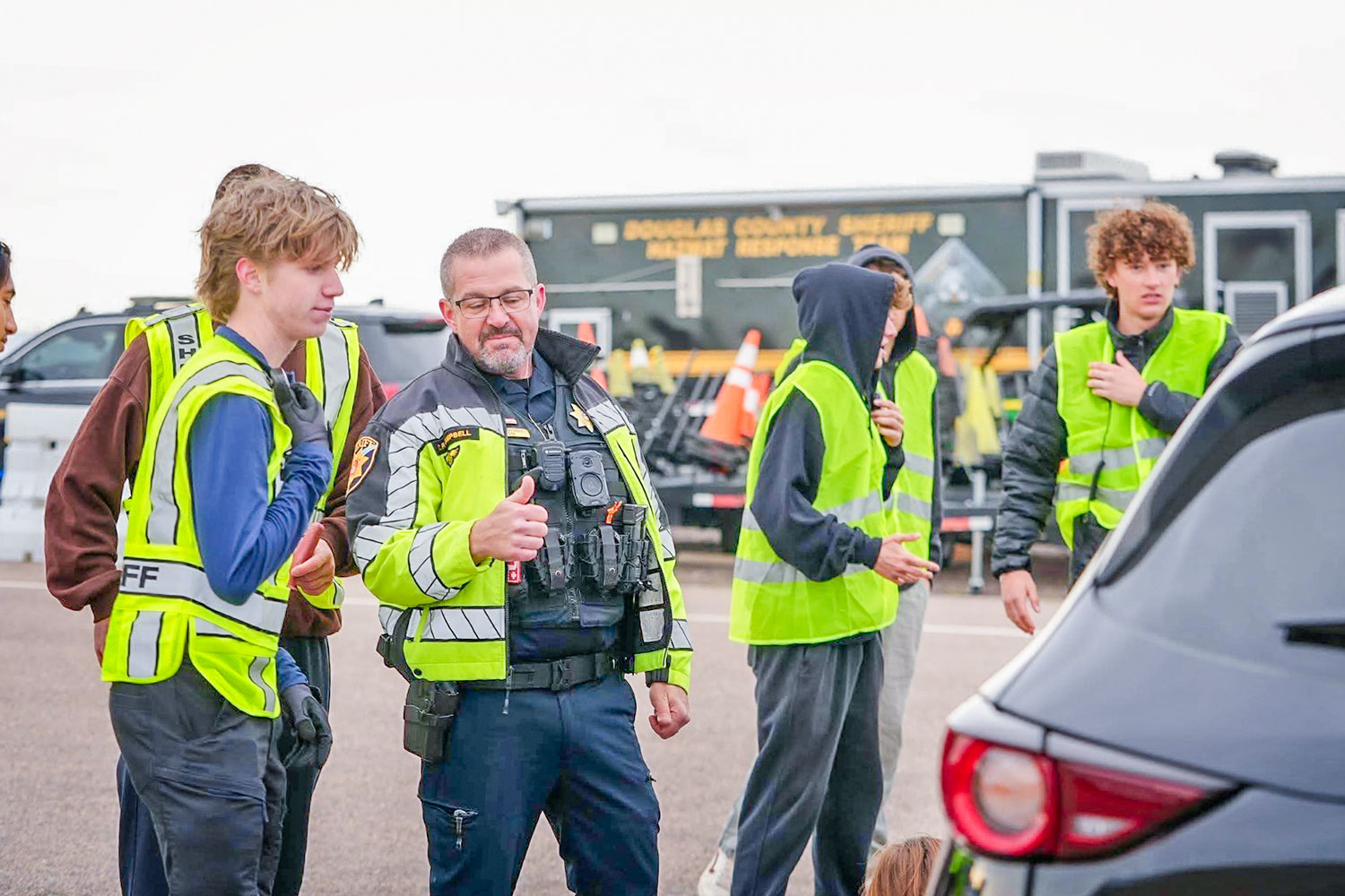 Newly-certified students at Rock Canyon High School’s Emergency Services (ES) program completed their training with a large-scale, mock drill last month at the Douglas County Sheriff’s Office (DCSO) driver training facility. Criminal justice, emergency medical services and fire science comprise the ES classes.