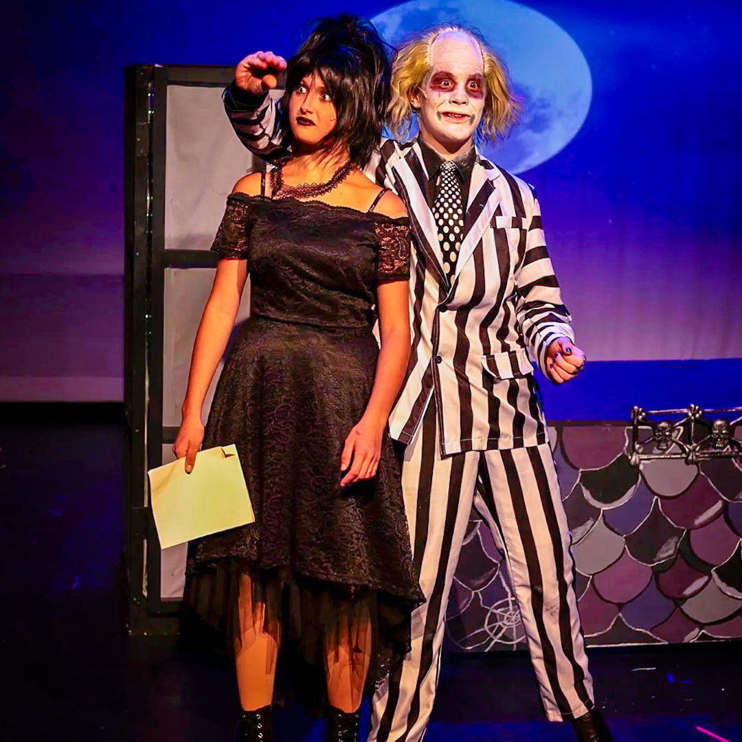 Motsenbocker campus student Cat Murphy as Lydia, a teenage goth girl who can see and communicate with ghosts and Beetlejuice played by Sloan Perry Lincoln Meadow campus student.