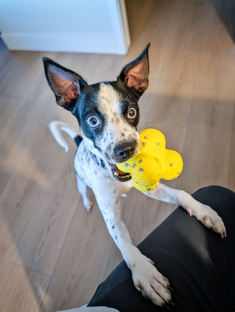 It is not uncommon for Oliver to play all night and sleep all day. To fuel his nighttime energy, Oliver enjoys snacking on all food, but most loves apples with peanut butter and the occasional Starbucks pup cup.