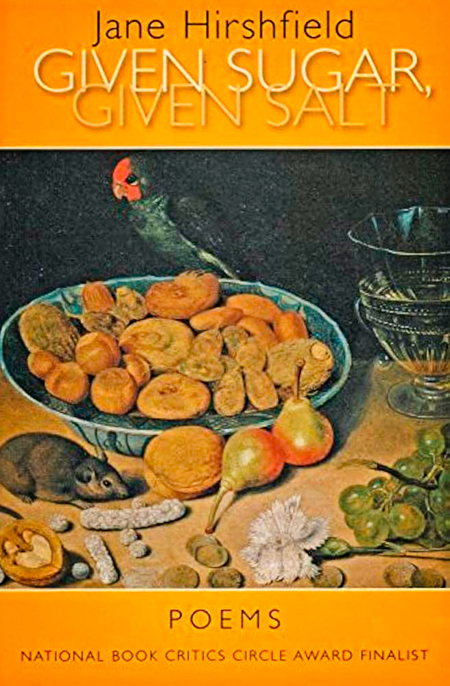 Given Sugar, Given Salt: Poems by Jane Hirshfield. Using mundane, universal or simple subjects, Hirshfield uniquely magnifies their meaning through her exploration. Aging, death, time, habits and sleep are just a few of the topics she studies.