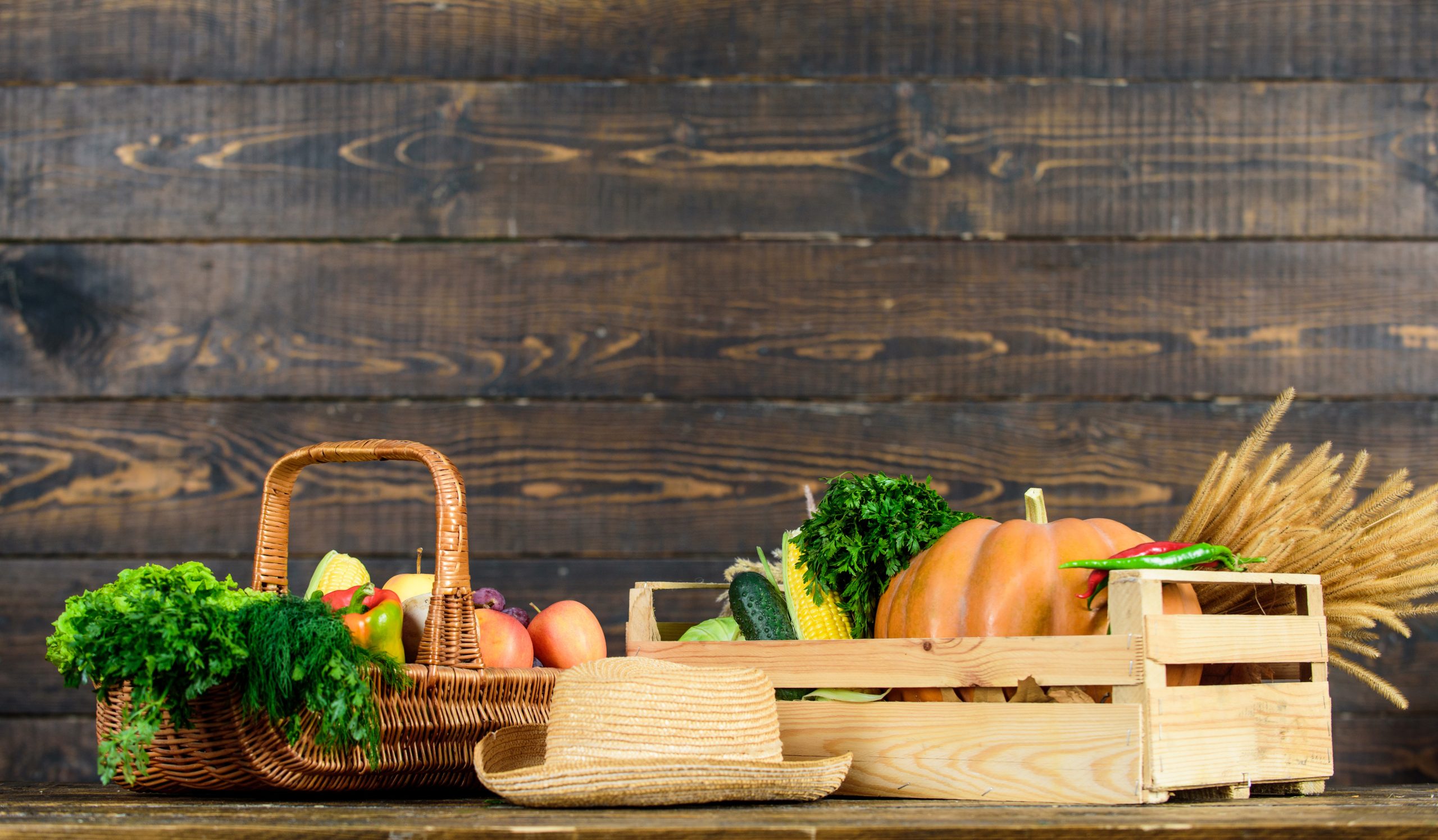Autumn harvest crops vegetables. Locally grown natural food. Farmers market. Vibrant and colorful vegetables. Homegrown vegetables. Fresh organic vegetables wicker basket. Fall harvest concept.