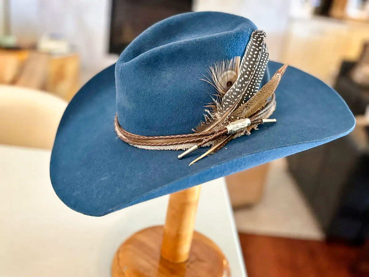 This “Maggie” hat was hand crafted and tailored to the client’s specifications: relaxed cowboy brim with the rounded fedora crown, added feathers and braided band.